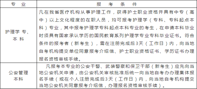 3.下表所列专业对报考条件、报考程序有特殊限制,考生报考须符合下表具体规定;考生个人或社会助学单位违反报考条件限制规定报考,分别由考生本人或办理集体报名的助学单位承担责任,并将受到不承认考试结果、不受理毕业申请的处理。