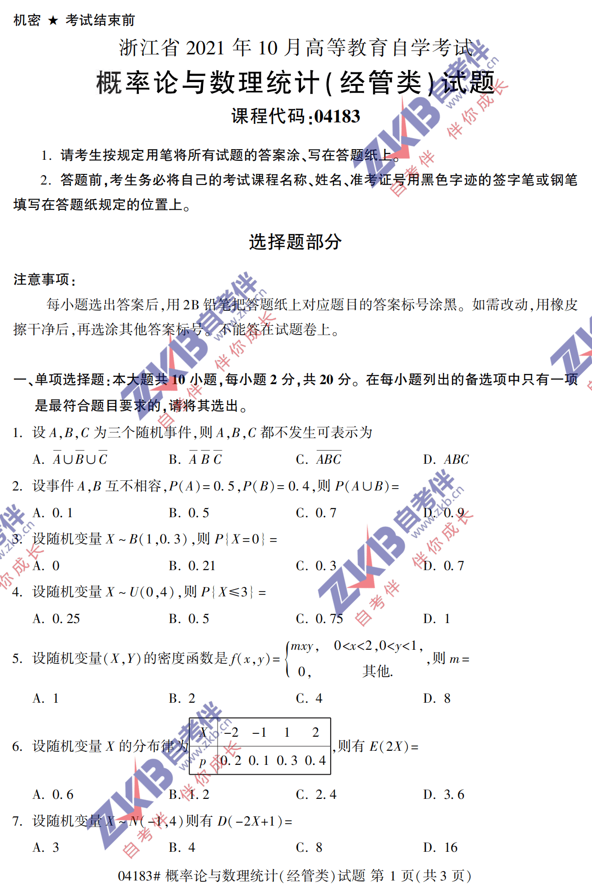 2021年10月浙江自考04183概率论与数理统计(经管类) 试卷