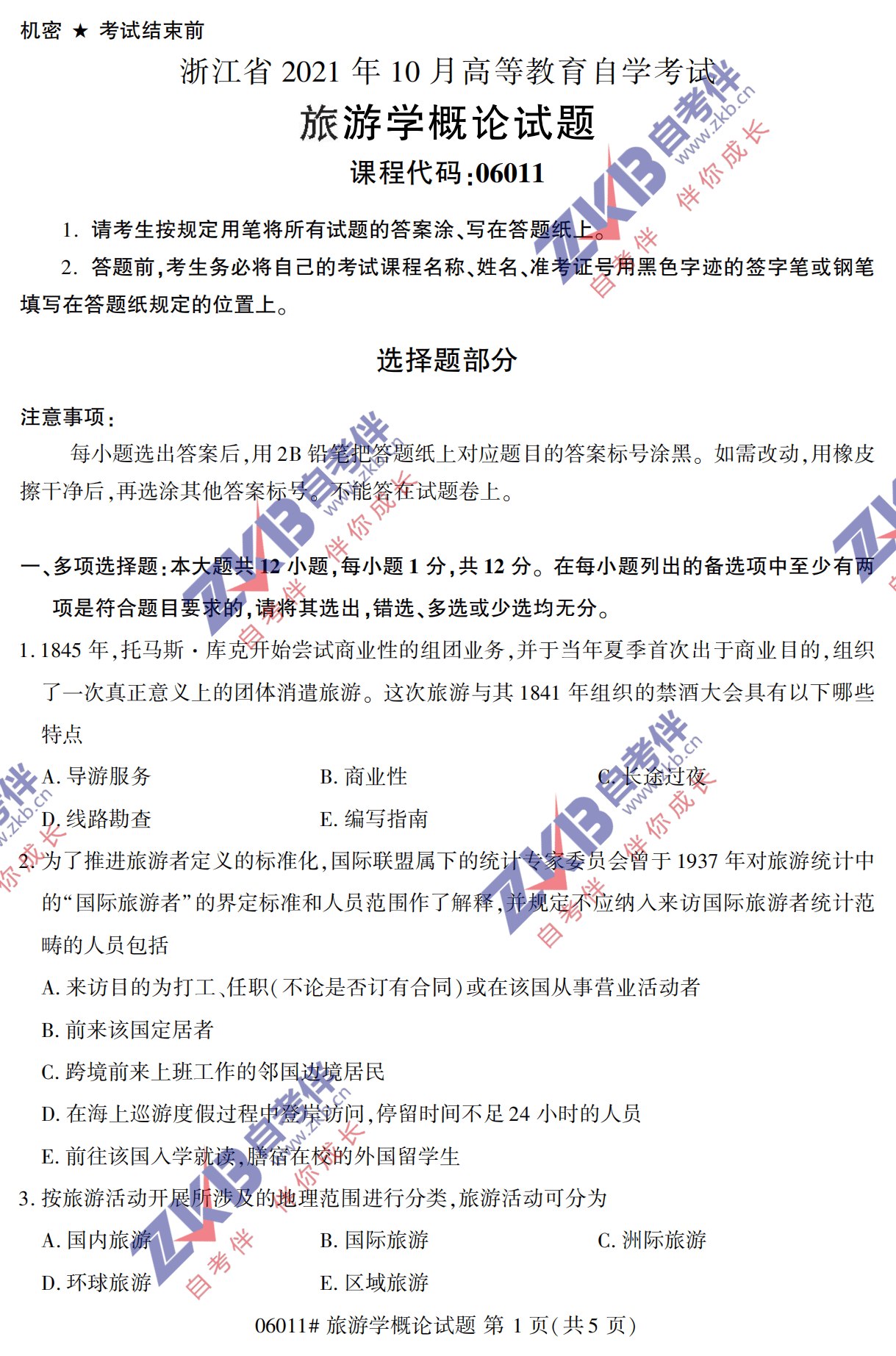 【导读】给大家整理了2021年10月浙江自考06011 旅游学概论试卷,希望能给你们带来一些帮助,快来浙江自考网看看吧!