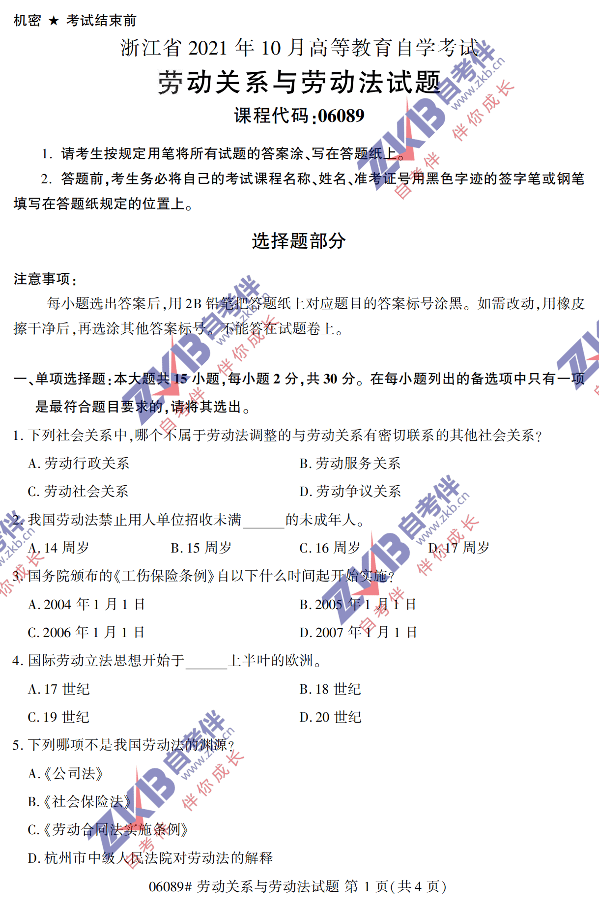【导读】给大家整理了2021年10月浙江自考06089 劳动关系与劳动法试卷,希望能给你们带来一些帮助,快来浙江自考网看看吧!