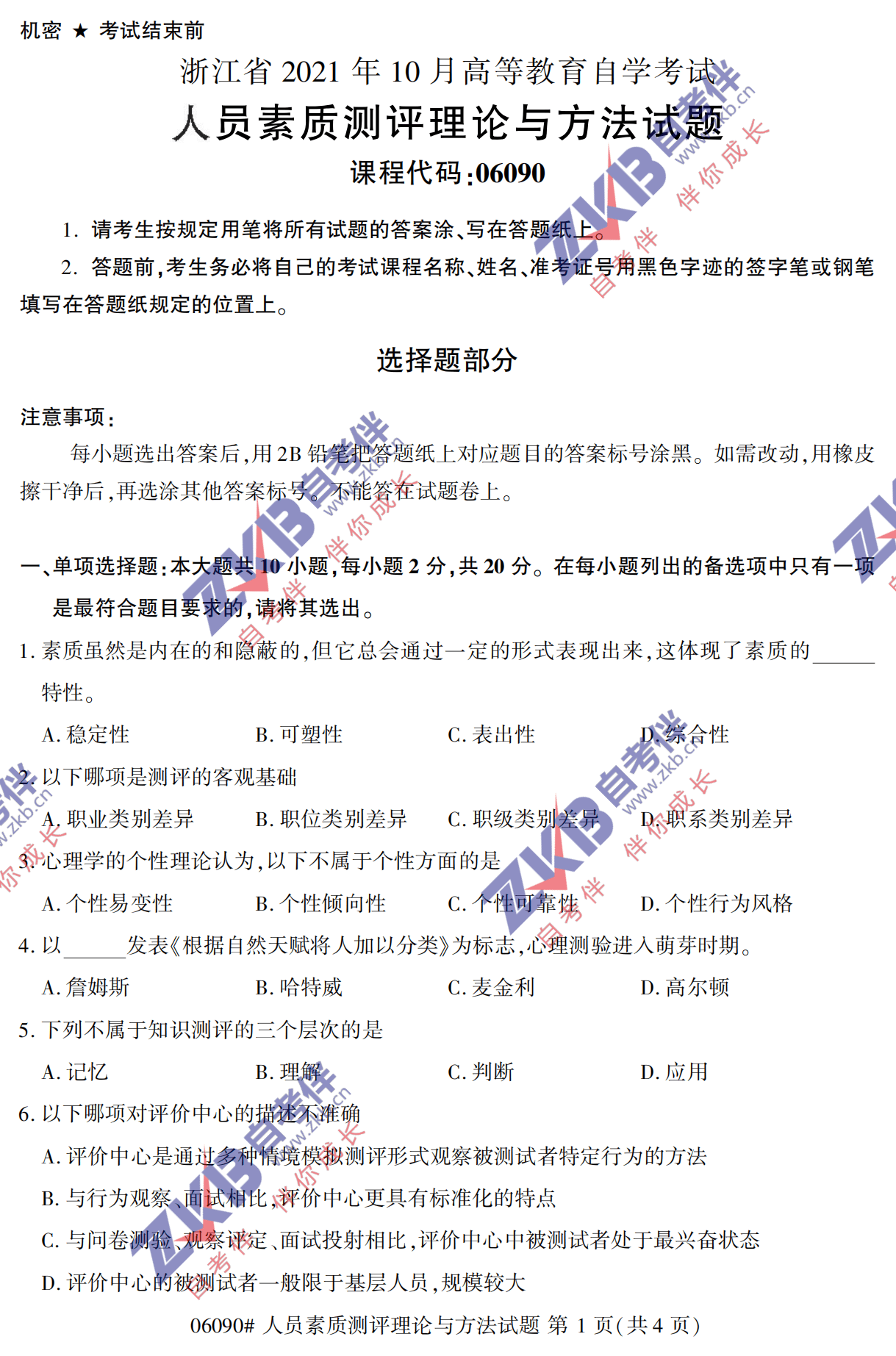 【导读】给大家整理了2021年10月浙江自考06090 人员素质测评理论与方法试卷,希望能给你们带来一些帮助,快来浙江自考网看看吧!