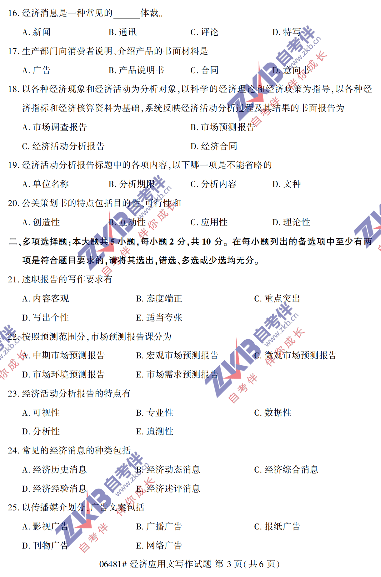 2021年10月浙江自考06481 经济应用文写作试卷