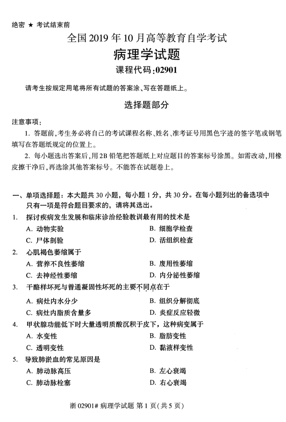 全国2019年10月自考02901病理学试题