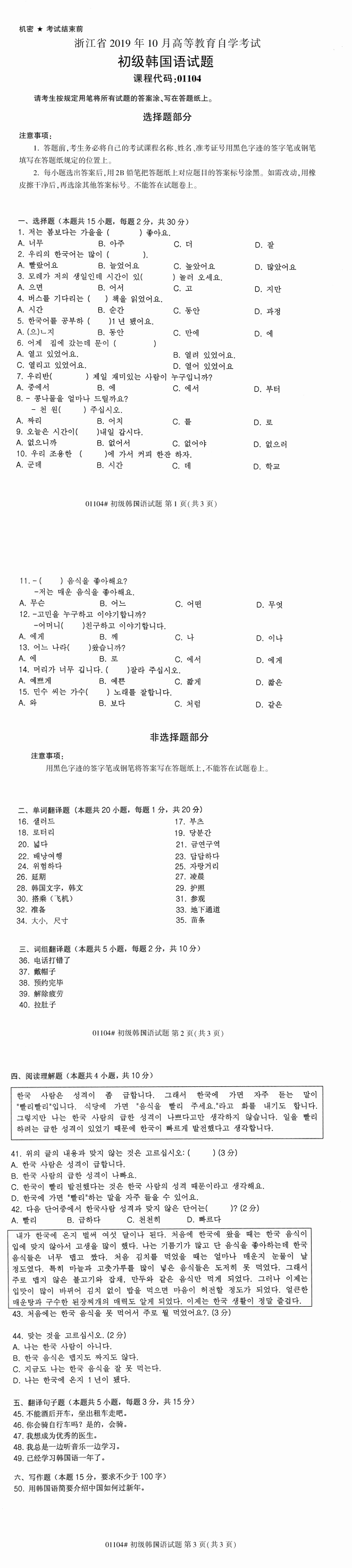 所在位置:浙江自考服务网 > 试题题库 > 历年真题 > 全国2019年10月自考01104初级韩国语试题